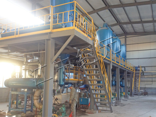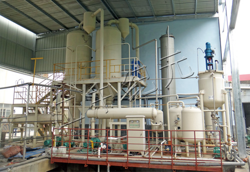 目前,在无机盐结晶装置中,往往因为设备只能间歇操作,造成 设备投资大、能耗大、占地面积大、操作人员多、生产效率低、 结晶颗粒产品品质低等现象,近年来,国际市场和国内市场对粗 盐的需求量呈上升趋势,对已定的成品盐粒径,还要求粒径范围 尽可能窄。国内真空制盐的粒度偏细,且均匀性差,适当增大盐 粒度,并提高均匀性,会使得盐结晶产品更具有市场竞争力,鉴 于此,我公司新研发生产的一种无机盐新型连续结晶装置,经过 前道蒸发工序来的饱和溶液(温度为60~90℃),计量进入连续 结晶装置中,先在真空状态下闪蒸一部分溶剂,再流经列管式冷 却器和强制循环泵,使得温度降至40~60℃,进入连续结晶装置 里的导流锥形筒中,溶液沿着导流锥形筒向上升至蒸发液面,此 时,在真空条件下,因为溶剂的不断蒸发,浓度达到过饱和,而 使得溶质析出,在蒸发液面处大量的晶体不断析出,并相互吸附 逐渐长大,在循环泵的吸力作用和晶体自重的重力下,带有大量 晶体的溶液沿着导流锥形筒的外面向下流动,晶体在重力作用下 继续向下流到装置底部的浮选器中,因为溶质的析出而消除了过饱和度的饱和溶液则进入强制循环泵的进口,晶体和进入列管冷却器的饱和溶液的分离是靠隔离筒完成的,强制循环方式采用了反循环方式,并采用后开式叶轮,具有流道大,转速慢,对晶体的破碎作用小,进入装置底部浮选器里的晶体,从浮选器底部进液管进入的溶液,经过浮选器内部的再分布器使盐水均匀向上方流动,盐晶体在浮选器中呈流化态悬浮,在浮选器的上端有喇叭形导流器,携带细晶的浮选盐水沿喇叭形导流器与浮选器筒体之间的环形区向上方流动,避免与下降的盐浆流发生干扰。浮选液向上经过喇叭形导流器上端的进液口,绕过环形隔离圈进入连续冷却结晶器内。此隔离圈能有效阻止连续冷却结晶器流下的盐浆经进液口的短路,而只能经过喇叭形导流器向下进入浮选器。经过浮选达到预定粒度的浓缩盐浆从浮选器下部的盐浆出口连续不断的排出。